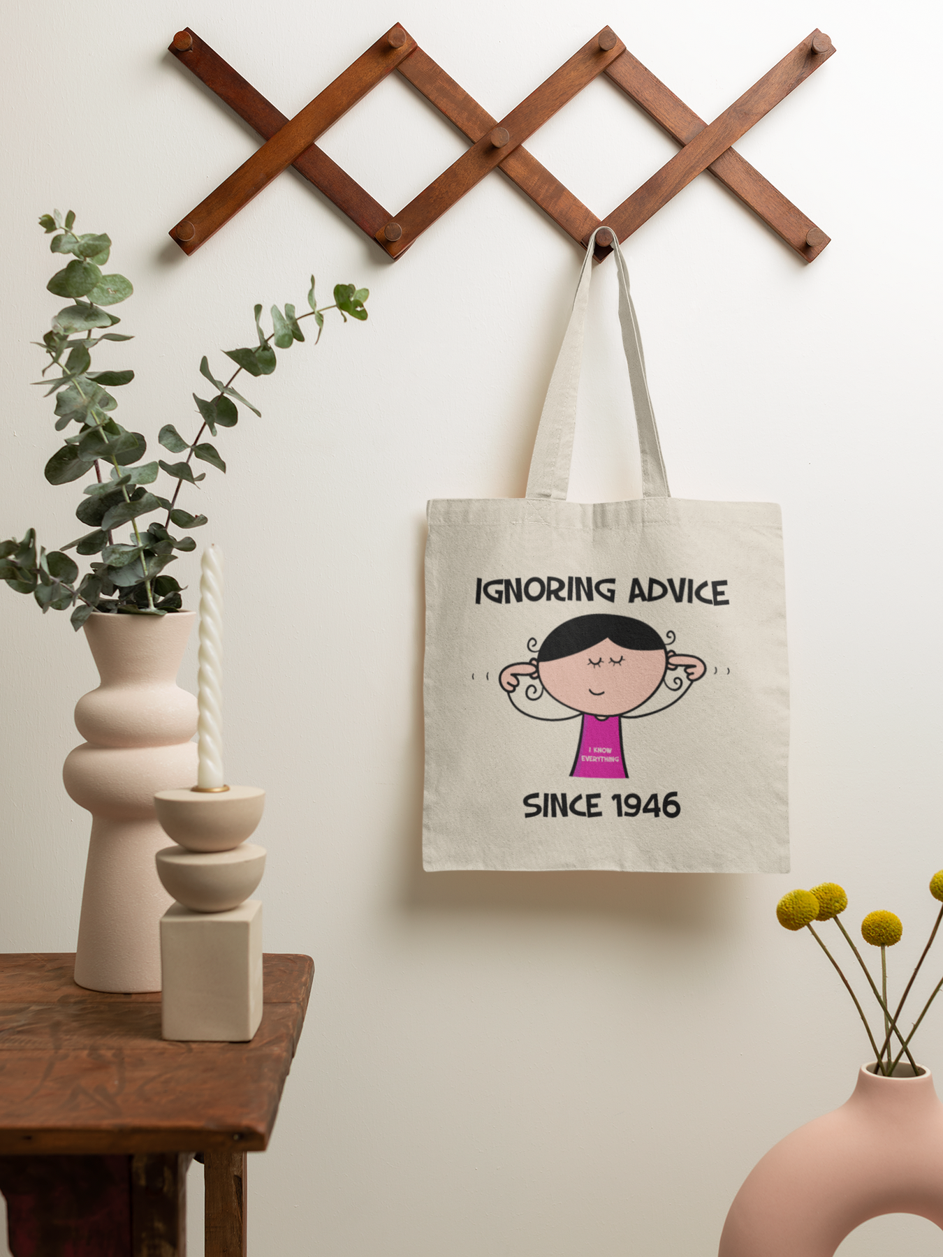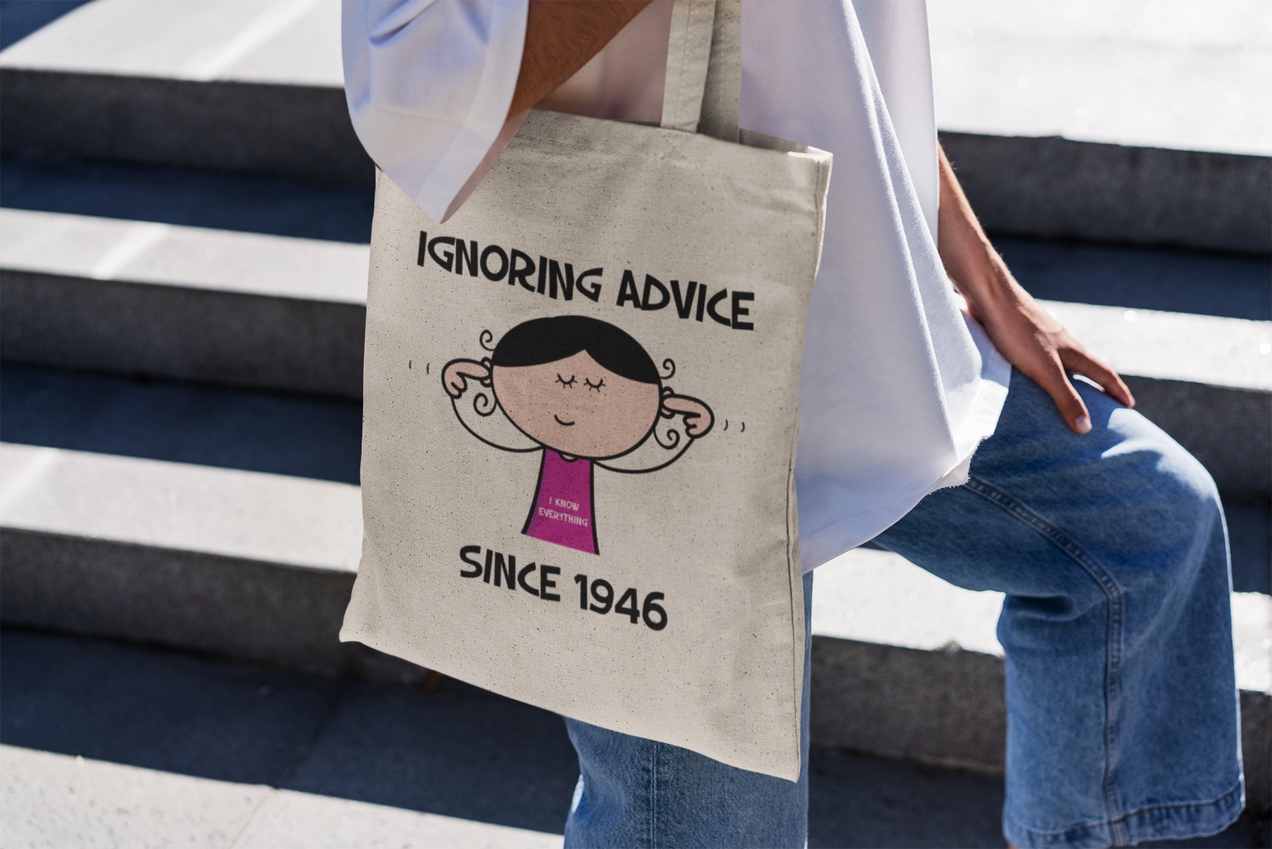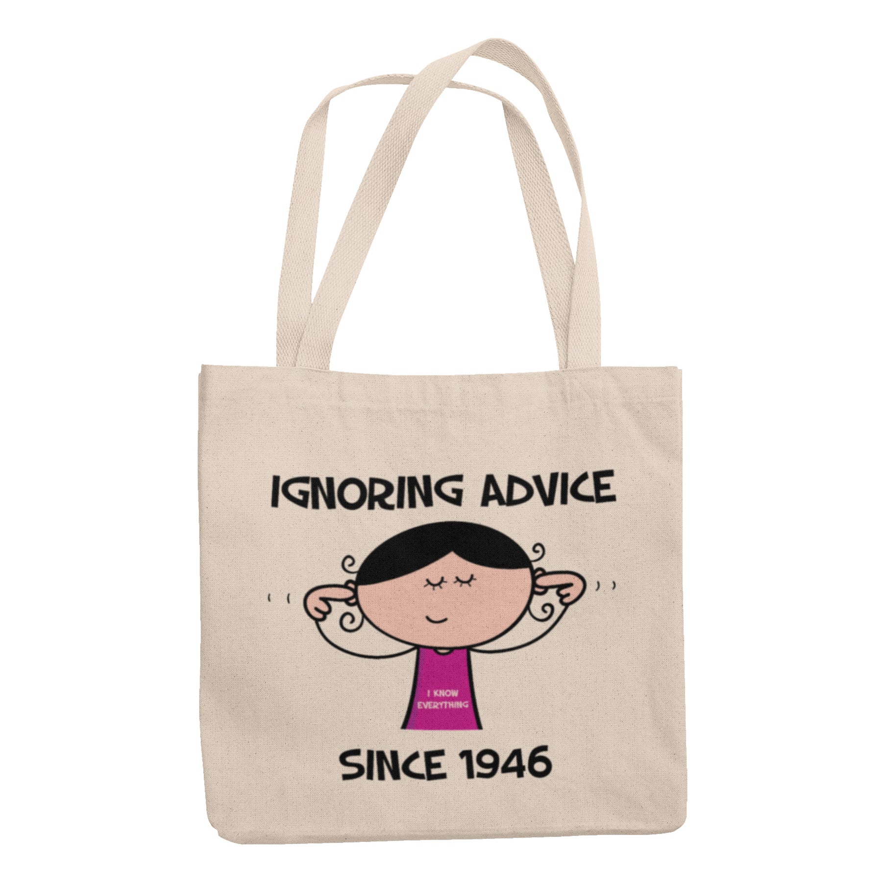 The standout feature of this tote bag is the eye-catching cartoon design of a lady with her fingers in her ears, accompanied by the playful slogan 'Ignoring Advice since 1946 ... I Know Everything!' It's a light-hearted way to celebrate her 80th birthday and embrace her wisdom and independence.