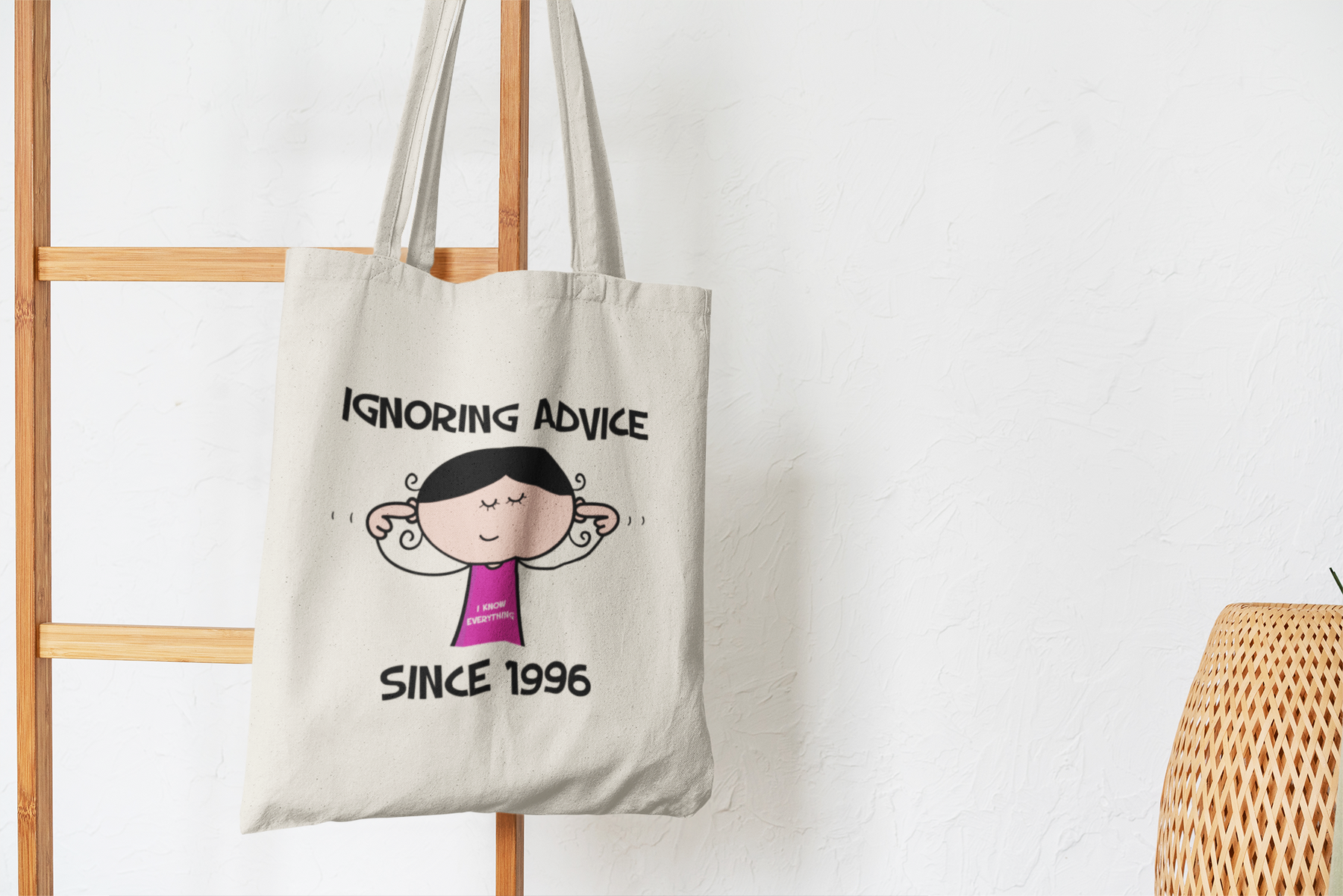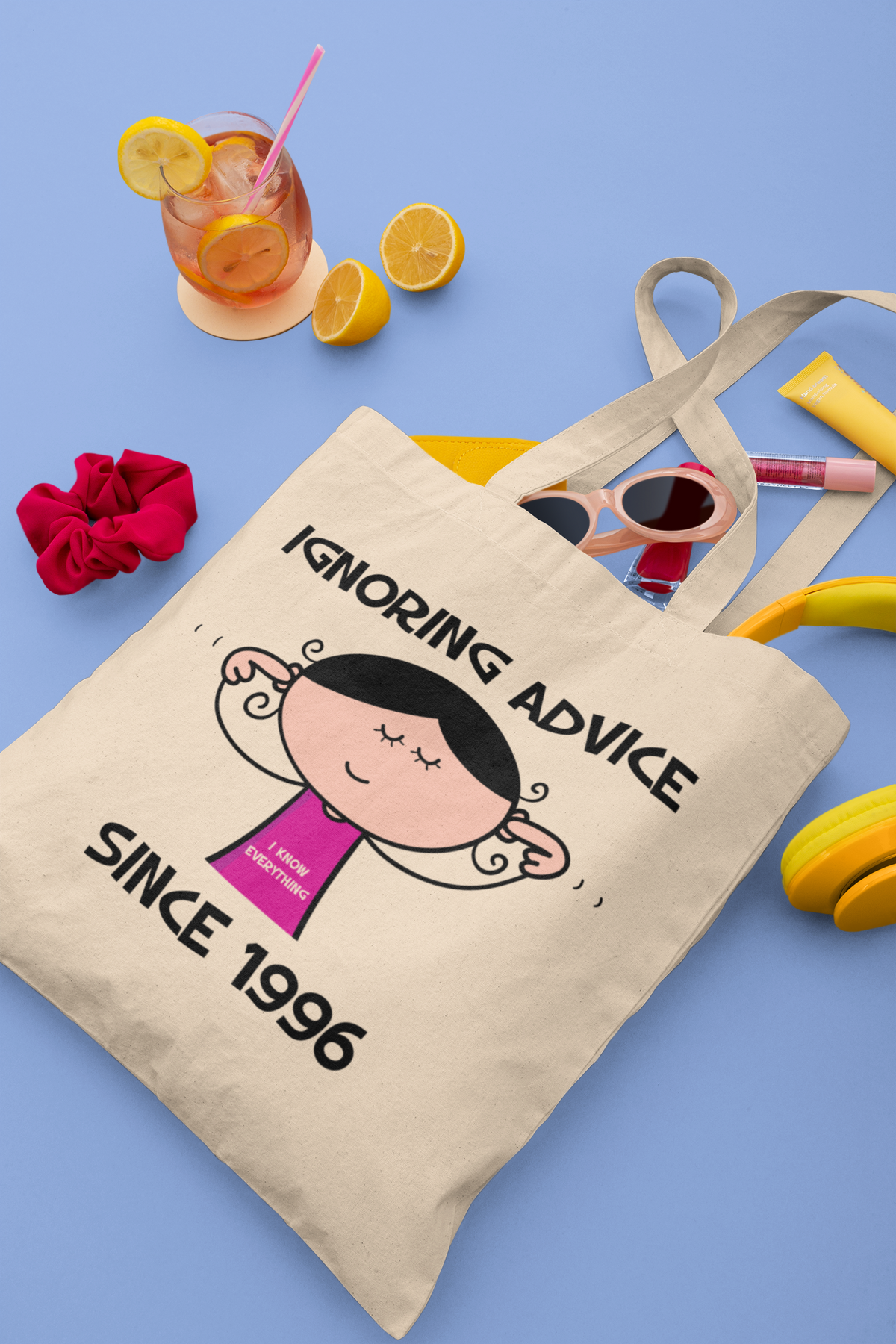 Featuring a delightful cartoon image of a lady with her fingers in her ears, this tote bag exclaims the slogan 'Ignoring Advice since 1996 ... I Know Everything!' It is a playful nod to the wisdom and independence that comes with age. Our tote bag serves as a stylish and practical accessory for everyday use or trips to the grocery store, allowing you to confidently showcase your unique personality.