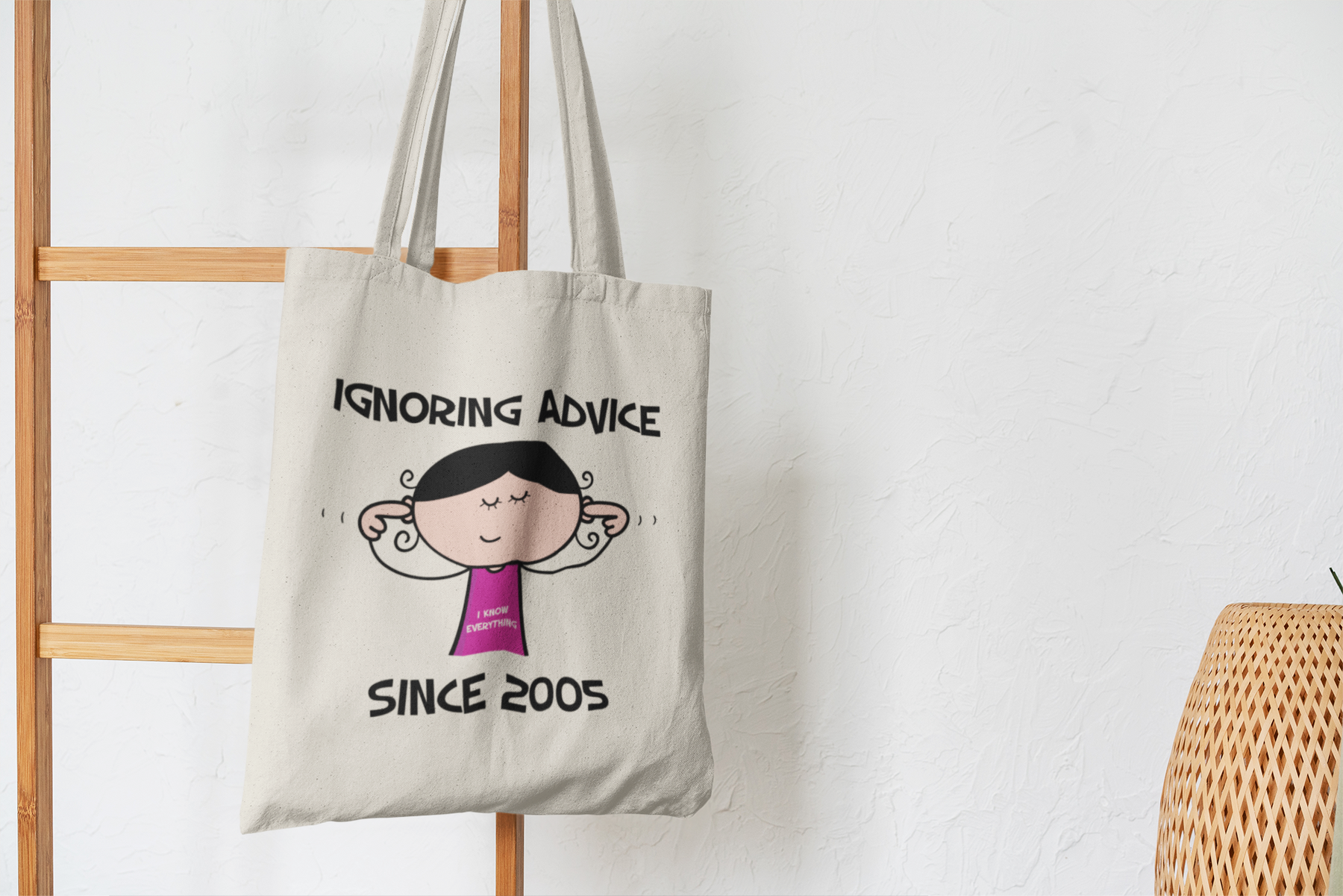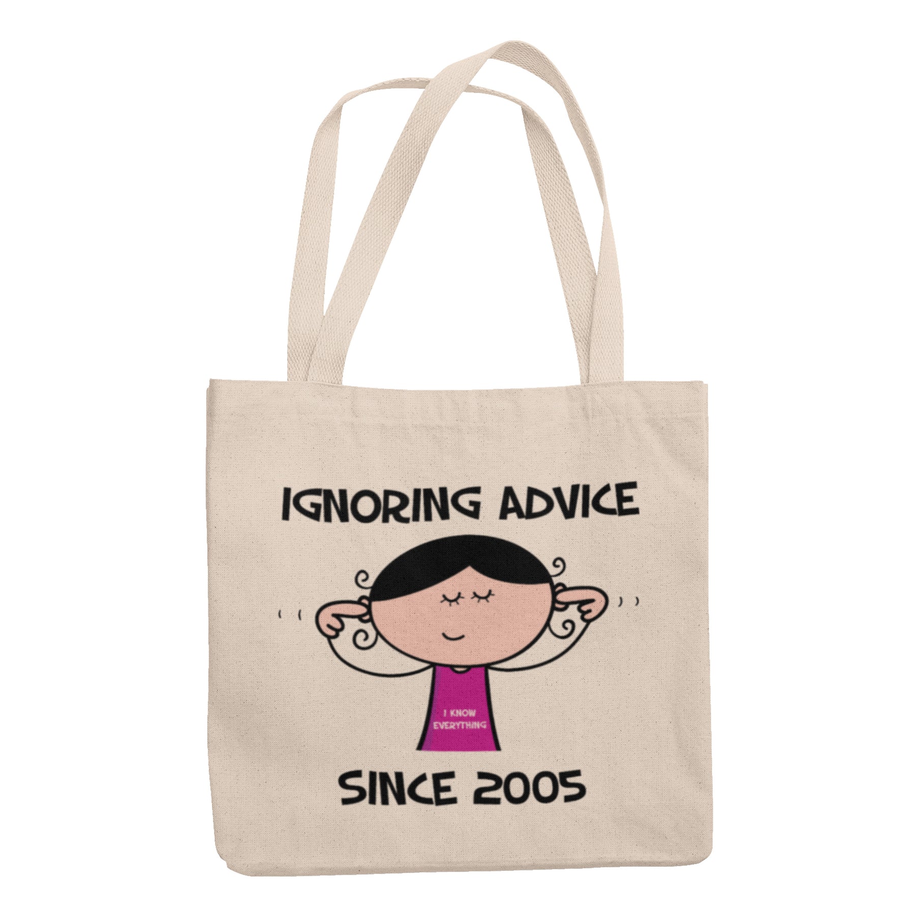 Featuring a vibrant design, this tote bag showcases a quirky cartoon of a lady with her fingers in her ears, accompanied by the hilarious slogan, 'Ignoring Advice since 2005 ... I Know Everything!' Not only will this bag add a touch of humour to any outfit, but it also serves as a reminder of the confidence and independence that comes with reaching the milestone of 21 years old.